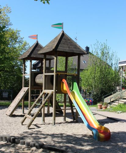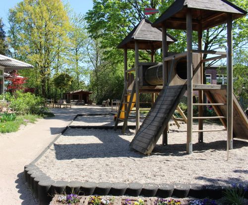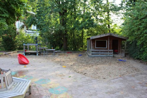 Sandkasten mit Matschbereich und Spielhäuschen